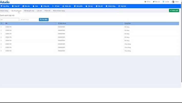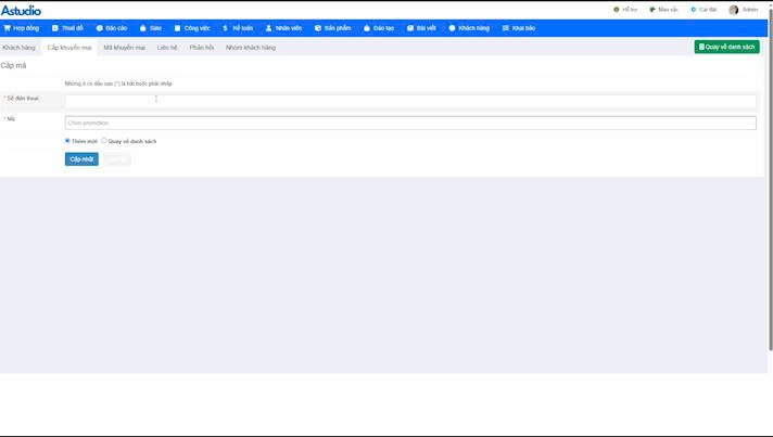 Trong mục khách hàng chọn mục cấp mã khuyến mại.